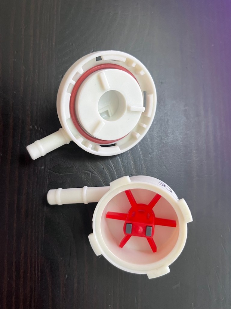 The CitiZ isn’t really that complicated inside. Despite using extremely sophisticated injection-molded components, it’s mechanically simple: there’s a pump, an inline thermoblock, a brewing unit, a flow meter, and a logic board. That’s it.  Given that the mechanicals worked, but the system was halting early, I guessed it had to be either the logic board or the flow meter.  And on the principle of do the easiest thing first, I pulled out the little flow meter.